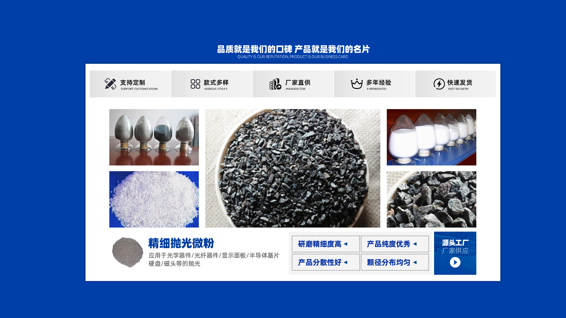 公司另外提供陶瓷砂輪專用砂,粒度有8#、10#、12#、14#、16#、20#、 24#、30#、36#至325#各種目數均可提供。是砂輪廠、耐火材料廠、噴砂、除銹廠的產品。